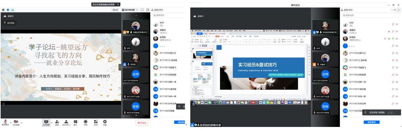 树立先进典型,践行青春使命。电子电气工程学院通过线上开展防疫志愿者心得交流大会,向同学们宣传志愿者们的无私奉献,鼓励更多的同学加入到志愿行列中来。在此轮疫情中,涌现了众多有爱心有责任感的志愿者们,他们坚守岗位,为在校的大学生们提供必要的后勤保障,同时也为核酸检测的“大白”们提供帮助。通过分享,更多的同学了解了基层一线的抗疫情况,强化了抗疫意识,丰富了抗疫知识。同时,承办校级学子论坛“眺望远方 寻找起飞的方向——就业经验分享论坛会”,邀请了三位优秀的2018级学生代表,为同学们讲述了人生方向规划、实习经验分享、简历制作技巧等内容,用同辈的力量传递正能量,为同学们搭建了一个交流互动的平台和向榜样学习请教的平台。