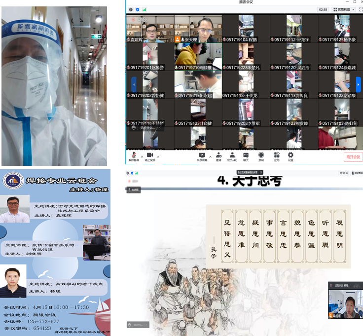 支部宣传委员杨瑾老师担任焊接系本科生的班主任,召开特殊时期的“云班会”。班会上,党员教师袁建辉同志为同学们作了“面向先进制造的焊接技术与工程系简介”的报告,刘晓明同志为同学们作了“疫情下宿舍关系的有效沟通”的报告,杨瑾同志为同学们作了“高效学习的若干观点”的报告。通过以上报告,帮助学生正确认识自己的专业,培养专业自豪感,同时从心理学的角度帮助同学们缓解疫情期间的心理压力,建立良好的室友关系,帮助同学们提高学习效率,培养了良好的学习习惯和思维模式。