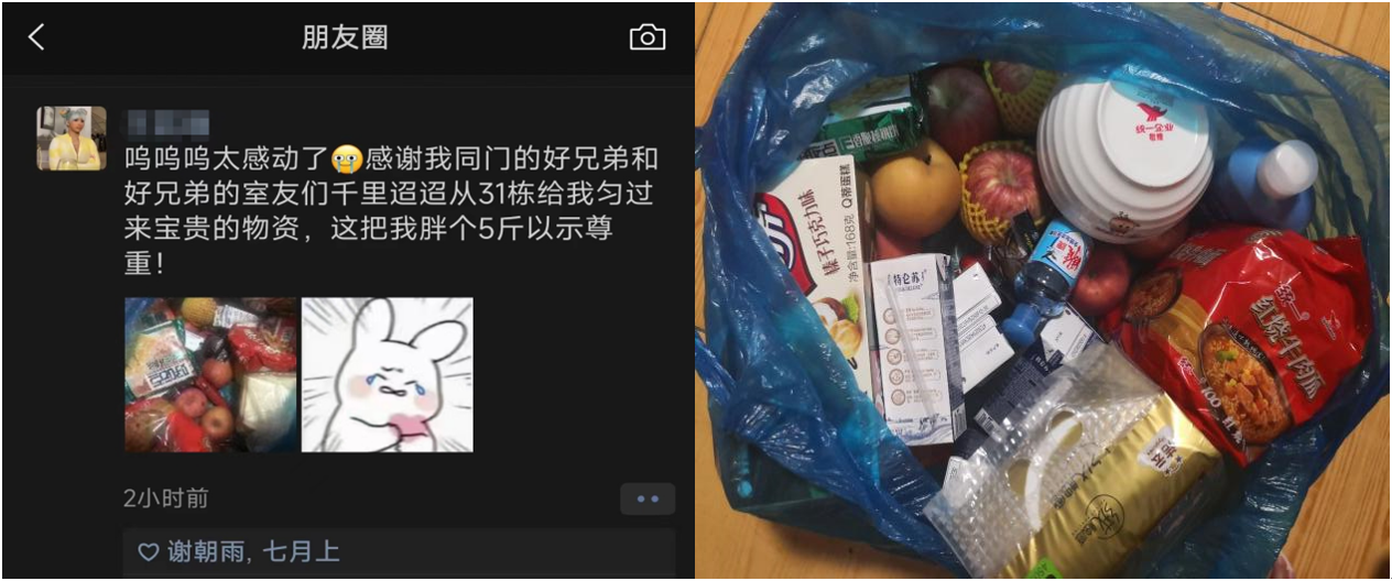 住在31栋的来自数字化精密加工仿真实验室的程耀天曾在组会交流时听到同门提过缺少生活物资,便时刻惦记着是否能找到机会提供帮助。4月23日,程耀天辗转找到了学校后勤的公众号“工程大后勤”,抱着试一试的想法,他在后台留言询问是否能够从六期31栋运送一些物资给19栋楼的同学。令他意外的是,很快他便接到了后勤负责人裘立行老师打来的电话。裘立行老师细心询问了相关信息,并主动提出帮忙联系六期的管理人员进行协调。同时,程耀天与同在一个实验室的林旭东和谢朝雨一同着手准备给同门的物资。受到他们热心行为的感染,他们的室友戴雨轩、贾东昇、李汉林也纷纷慷慨相助,拿出了自己的水果、面包等物资,希望能够帮助到那位“远在”19栋的同学。
