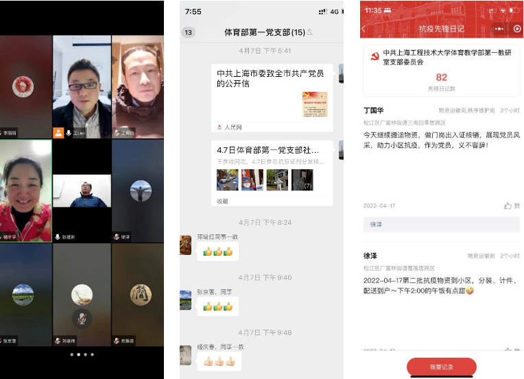 党建引领,凝聚人心,统一思想,这是体育部第一教研室党支部一贯秉承的工作方式。在上海市委组织部“致全市共产党员的一封信”和上海市委“致全市共产党员的公开信”发布的第一时间就组织党员学习。党支部第一时间通过腾讯会议召开了疫情防控专题组织生活,深入学习习近平总书记关于疫情防控重要指示精神,认真贯彻孙春兰副总理在上海调研疫情防控工作时提出的要求,落实校党委关于疫情防控的工作部署,贯彻“三个讲清楚”,激励大家发挥党员的示范带动作用,严格落实疫情防控责任。全体党员会后落实“双报到”,投身社区抗疫志愿者服务,并在社区志愿者工作结束后在先锋上海小程序里记录“抗疫日记”。