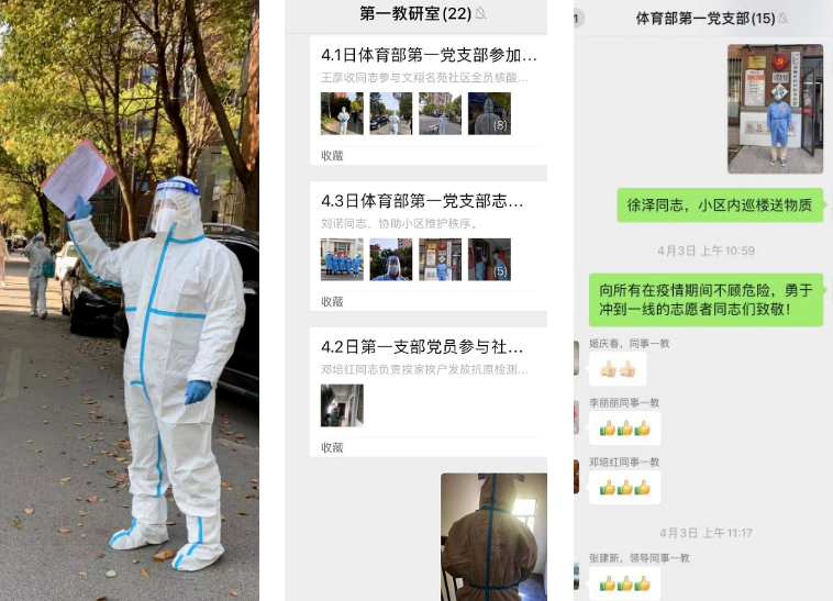 在人人争做抗疫先锋氛围的感召下,支部党员同志和教研室老师纷纷利用课外时段响应上海市委号召,积极投身于社区抗疫志愿者活动。支部共14位党员,全员参与社区双报到,除了有身体原因和其他特殊原因无法参与社区志愿者的2位党员外,其他12位党员同志主动参与了学校或社区的志愿者,参与率85.7%,截至今日志愿者活动共出勤85人次,平均每位党员出勤7次。