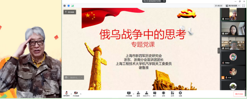 虞书记对谢鲁淮老师应邀参加此次云端报告深表感谢。谢鲁淮是松江老兵宣讲团的主力成员,拥有非常丰富的理论和军事报告经验,他的讲课内容生动,意义深远,深受欢迎。本次报告会前充分准备,结合时事,主题突出,引人入胜,把思政教育融入到学院三全育人过程中。虞书记强调,广大与会党员要认真领会谢老师报告的深刻内涵,关心时事政治,分析思考战争背后的真实原因,坚持当好“历史的见证者”。作为研究生党员,即将踏上工作岗位,要坚持围绕“打铁还需自身硬”的目标要求,不断提升自身综合素养,时刻牢记党员形象,争做国家先进制造业所要的创新型人才。