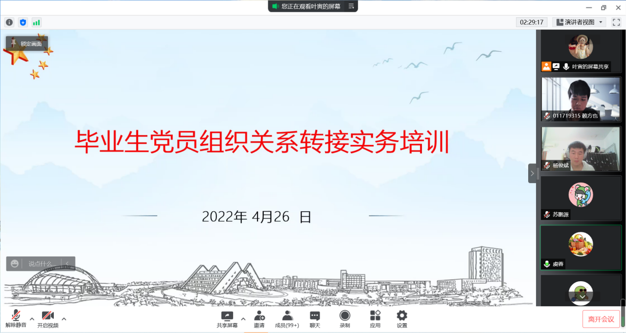 会上,组织员叶寅从“什么是党员组织关系、为什么要转接党员组织关系、如何转接党员组织关系”等方面为毕业生党员详细解读组织关系转接实务,并结合往届毕业生党员在实际过程中的常见问题进行了案例分析,强化毕业生党员对组织关系转接的重视,进一步加强组织关系转接的规范性和准确性。