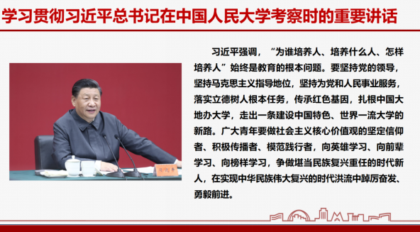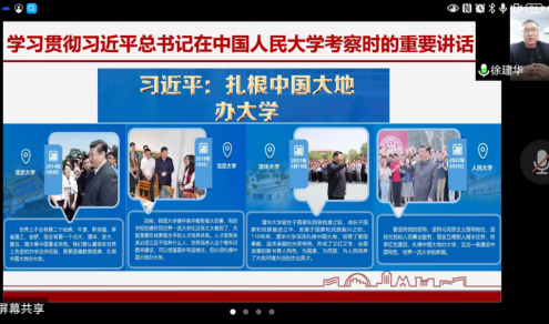 学院党委书记徐建华领学《习近平在中国人民大学考察时强调 坚持党的领导传承红色基因扎根中国大地 走出一条建设中国特色世界一流大学新路》(人民日报2022年4月26日第1版)。与会人员围绕深刻领会习近平总书记在中国人民大学考察讲话的重大意义、丰富内涵、实践要求,谈学习体会,谈思考感悟。
