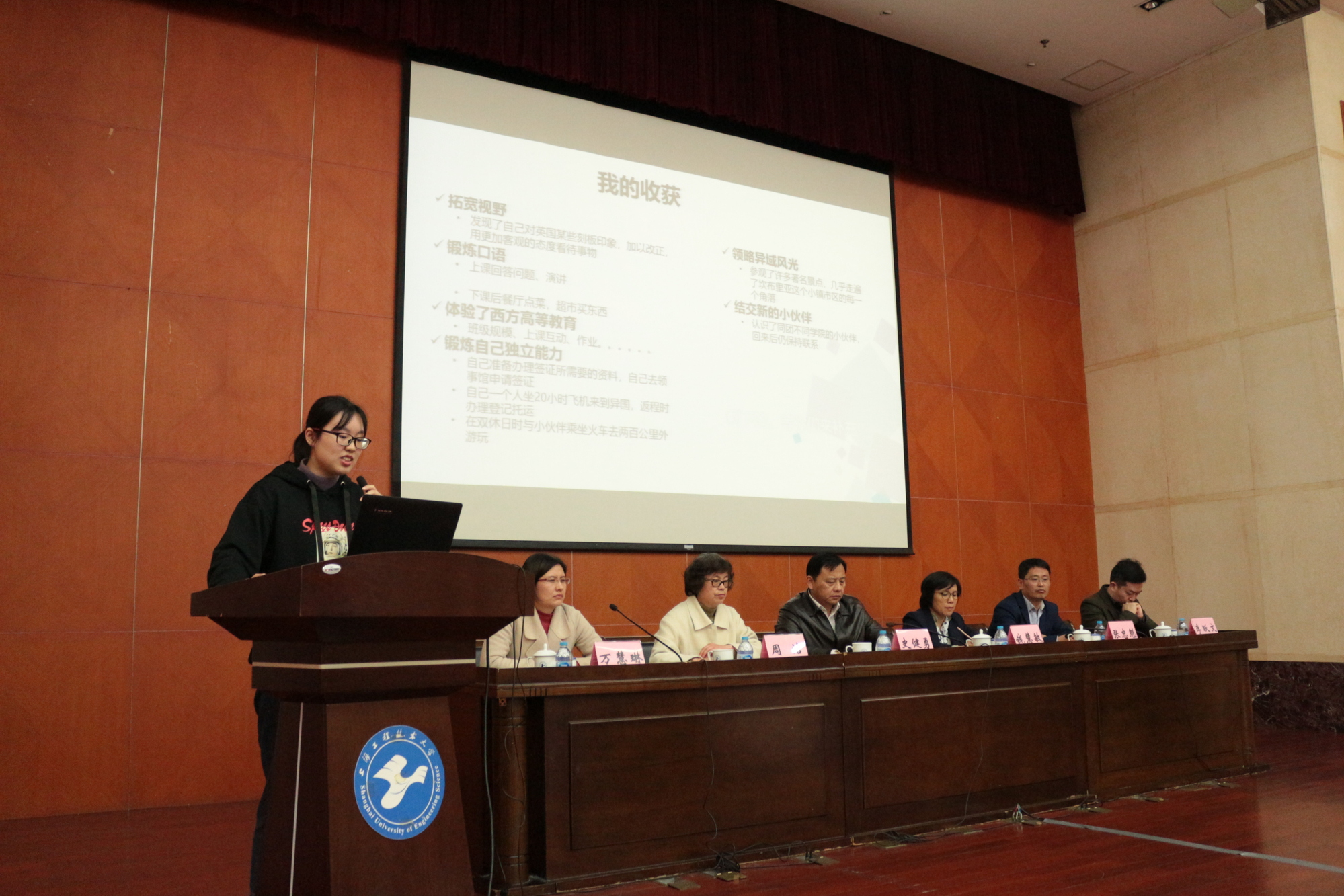 2018年管理学院国际化产学合作教育各团组学生代表分享了自己的心得体会。“喜悦号”邮轮团项目代表、2017级旅游管理专业马世超同学增加了对专业学习的整体熟悉度,学习到更多专业的知识,体会到要随时保持积极热情的心态去体验任何事情,要学会发现问题;英国坎布里亚大学交流项目代表、2017级国际经济与贸易专业钱君烨同学拓宽了自己的视野,锻炼了英语口语能力,领略了异域风光,结交了新伙伴,明确了自己未来的方向;加拿大多伦多大学交流项目代表、2016级人力资源管理专业朱亦佳同学感受到了世界名校的学习环境和氛围,对中西方文化差异有了一定认识;美国圣克劳得州立大学交流项目代表、2015人力资源管理专业吴文嫣同学从最初的满心好奇,到之后逐渐融入其中,再到最后临近尾声时的不舍,体会到要尽自己所能去了解世界,走出门看一看,开拓自己的眼界;香港教育大学交流项目代表、2015级工程管理专业岳春旭同学也向我们介绍了境外产学合作教育经验,他感受到了香港教育大学严谨开放的学术氛围、香港城市中传统与现代的结合,并收获了与小伙伴们互相照顾的真挚友谊。