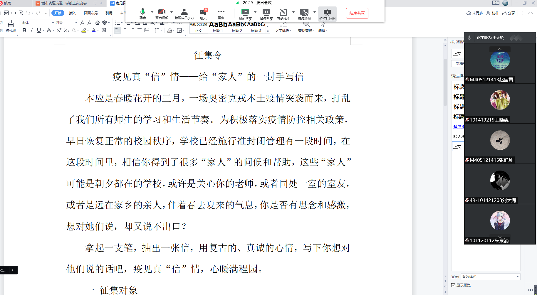 交流会还对学院上半年勤工助学特色活动的开展计划进行说明,鼓励大家积极参与,此次活动的主题为“疫见真信情——给家人的一封手写信”,“家人”可以指学校、老师、室友、同学、父母、亲人等,主要表达对他们问候的关心、思念和感激感恩之情,用传统的方式表达共度时艰的信心,传递正能量,弘扬主旋律。