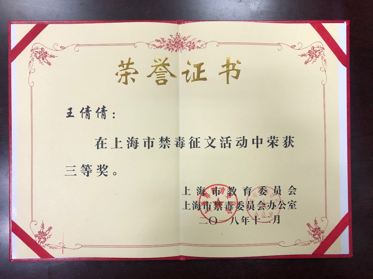 经上海市教育委员会、上海市禁毒委员会办公室对全市征文的评审,在大学组五名获奖人员中有两名为我校学生,我校中法埃菲时装设计师学院学生杨子乔荣获二等奖,服装学院学生王倩倩荣获三等奖。