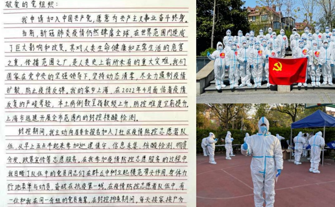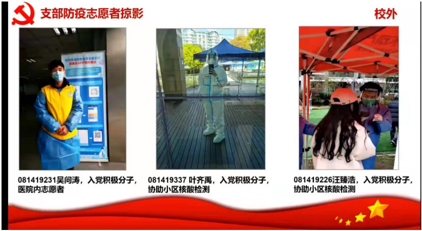 做党组织的“先锋队”,投身抗疫一线,冲锋在前、敢于担当,在实践考验中增强党性。继续教育学院入党积极分子陈羽,第一时间报名支援防疫一线;管理学院入党积极分子戴晟元主动请缨,担任临时隔离楼志愿者,从“每天两次送餐”到“随时待命的核酸检测”,从“志愿者自发集结”到“互相之间默契配合”,这份共克时艰的经历让他切身体悟到医护人员的不易与守护上海抗疫的决心,成为他党性历练中宝贵的经历。