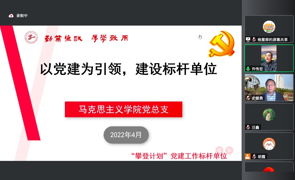 马克思主义学院党总支书记许传宏从党总支的基本情况、标杆单位建设指导思想、基本原则、五大工程、预期成果与组织保障五个方面介绍了“党建工作标杆单位”建设的计划。党总支副书记、院长刘志欣,委员于凯、严运楼、刘芳分别对马克思主义学院党总支“党建工作标杆单位”建设进行了交流。