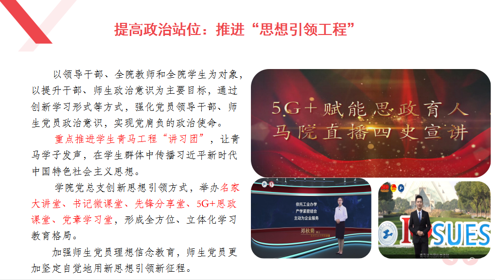 史健勇副书记肯定了马院党总支“党建工作标杆单位”建设方案中制度性的安排和目标性的预期,同时提出了三点意见建议。一是要对标对表。学校高度重视马院建设,把推进马克思主义学院党总支“党建工作标杆单位”建设,作为落实中央、市委文件精神,推动马克思学院内涵发展,提升育人实效的重要举措。学院党总支“党建工作标杆单位”建设要结合新时代高校党建“双创”工作重点任务指南的5个到位一级指标、12个二级指标、33个三级指标,形成具有特色亮点、示范引领作用的成果材料支撑。全体教师要齐心协力,做到目标导向与问题导向有机结合。二是活学活用。要在政治和思想引领过程中,真正落实建设方案中的五大工程。学院教师要在认真学习习近平总书记在中国人民大学考察时的重要讲话基础上,思考如何把标准化建设与实际教学科研、作风建设有机地整合,要进一步深化方法。三是入脑入心。要拓展视域,跳出马院看马院,通过看学生整体的思想状况看教学效果。马院的工作目标要更加明确,落实的各项措施既要有责任人也要有分工与合作,横向到边纵向到底,工作不留空白。要构建一个统一协调平台协同融合发展,形成学校的一张党建工作品牌。