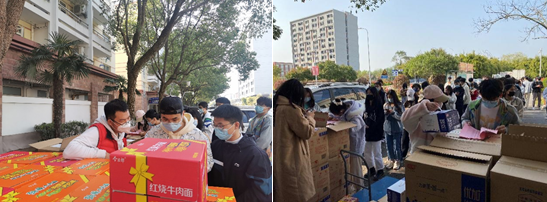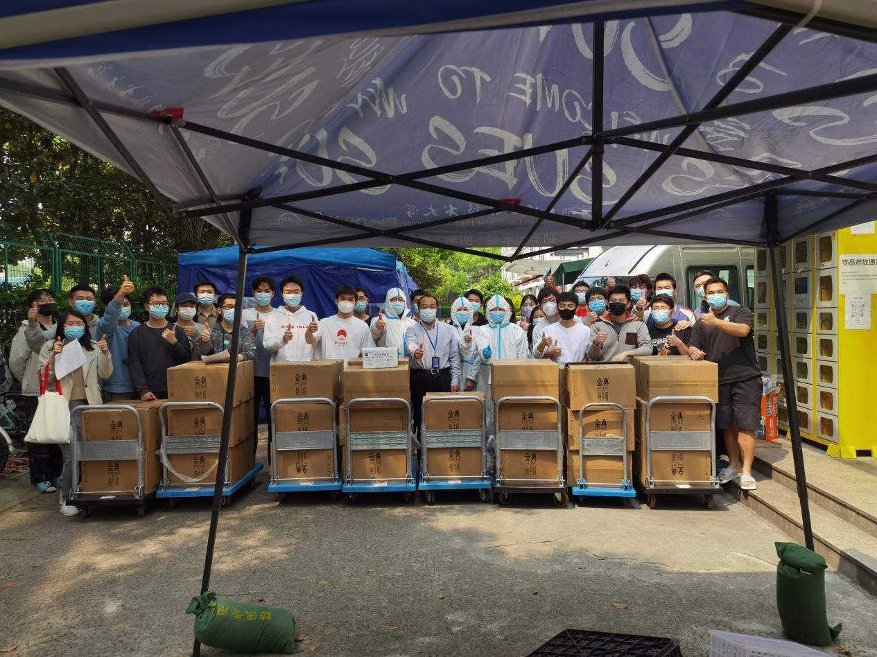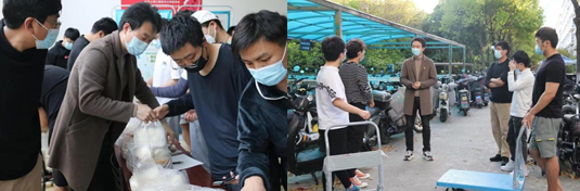 面对封闭管理期间同学们的就餐问题,研究生第三党支部的各位党员积极主动挑起楼内志愿者的大梁,每天按照人数领取盒饭,早出晚归为宿舍同学们挨门挨户地配送餐食。
