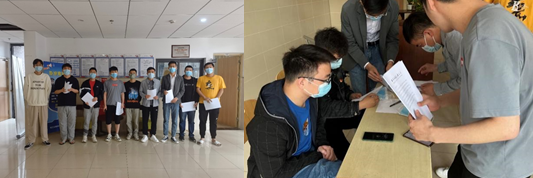 为响应校园疫情防控工作,研究生第三党支部组织支部成员成立临时党小组,对宿舍楼逐一进行核查,清点宿舍楼内的在校人数以及核酸采样的落实情况。同时,本支部在宿舍楼设立党员值班服务先锋岗,将学校网格化管理工作要求落实落细落地。先锋岗由党小组成员进行轮流值班,每两位党员轮班一个小时,一天轮值十四个班次。党员值班期间协助宿管阿姨展开工作,保证同学们在规定时间有序出门;做好防护知识宣传,如提醒同学们佩戴好口罩或为没有口罩的同学提供口罩;时刻准备消毒酒精,以便同学们进出宿舍楼消毒等。