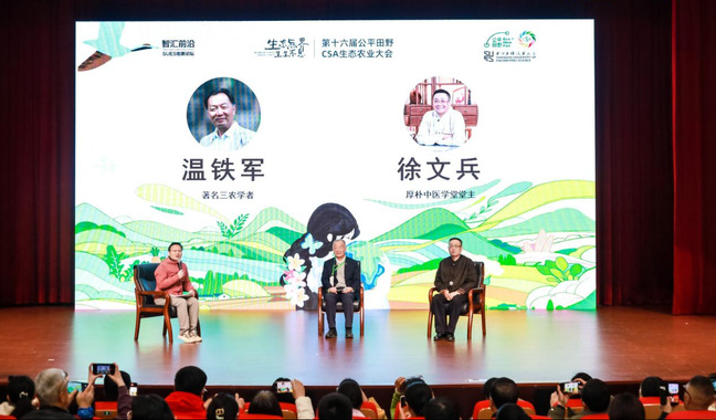 主旨论坛环节,著名“三农”学者温铁军与厚朴中医学堂堂主徐文兵围绕“农医同根”理念展开深度对谈,成为全场焦点。复旦大学哲学学院教授王德峰、中国蔬菜协会副会长徐振兴、公平田野发起人石嫣博士等嘉宾也分别从哲学视角、产业实践等维度,分享了对生态农业价值与CSA模式内涵的深刻见解。