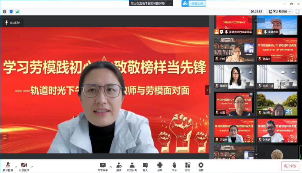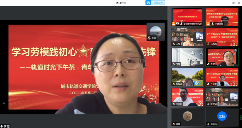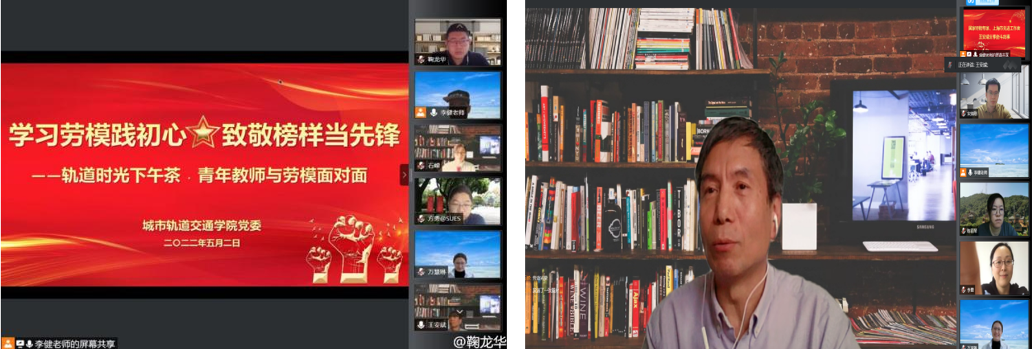 为进一步弘扬劳模精神、劳动精神,营造学院青年教师积极向劳模学习、向先进学习的浓厚氛围,为青年教师成长发展提供强大的精神动力,5月2日下午,“学习劳模践初心,致敬榜样当先锋——轨道时光下午茶﹒青年教师与劳模面对面”在线举行,上海市先进工作者、城市轨道交通学院王安斌教授,校工会常务副主席李霞,学院党委书记万慧琳,党委副书记、院长刘志钢出席活动。全院青年教师及其他教师代表近90人参加活动,活动由院工会主席李健主持。