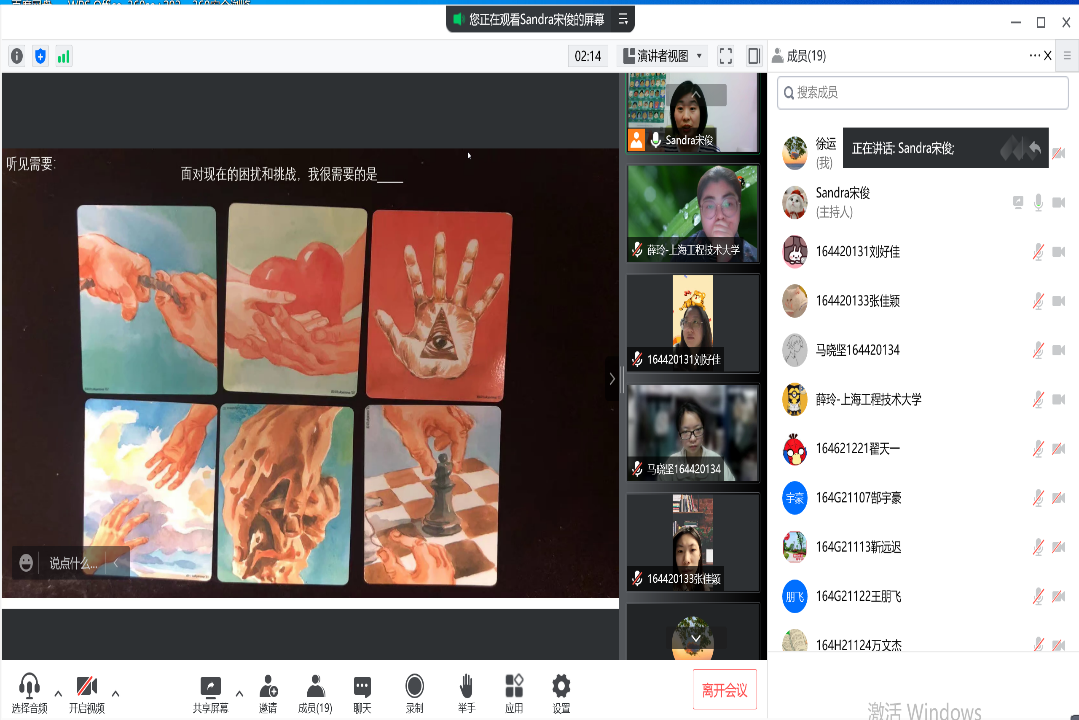 宋老师随后向大家展示了一系列图片,同学们从中选择并分享自己的感受。从听见特质、听见需要、听见温暖、听见温暖四个方面,同学们敞开心扉,分享当下自己的困扰/压力,希望自己被看见,需要被满足。而在这段艰难的时光中,同学们也感受到很多温暖的时刻。最后,宋老师送给大家一首歌——你要相信这不是最后一天,结束了本次团辅。