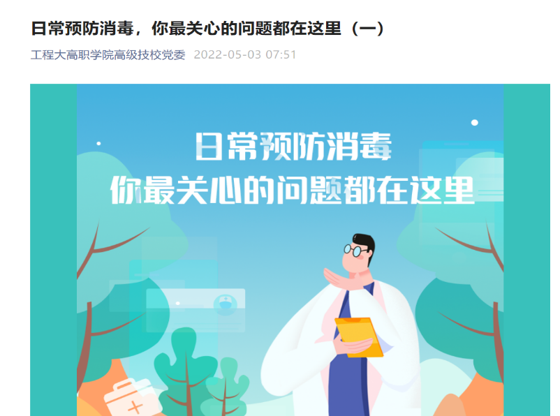 宣传科对全校教师及学生开展消毒知识宣传,通过党委微信公众号、校内电子屏等媒介在全校师生范围中推广普及单位消毒和日常预防消毒等系列知识。