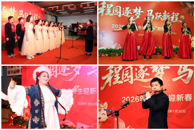 1月30日,程园逐梦·马跃新程——上海工程技术大学2026年“师生迎新春”联欢活动在松江校区第二食堂程园餐厅火热开展。学校200余名留校师生代表欢聚一堂,共品年味、共话团圆、共启新程。教育部学位管理与研究生教育司副司长、国务院学位委员会办公室副主任、上海市教育委员会副主任栾宗涛,上海工程技术大学党委书记李江,校长娄永琪,党委副书记、副校长徐阳,副校长王岩松、夏春明,上海市教育委员会学生处副处长俞冶论等出席活动。