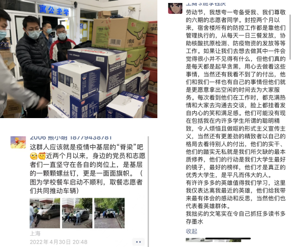 管理学院温欣老师,材料工程学院高宜文老师,主动承担起六期学生的陪同就医、协调购药、取药、紧急物资送达等重要保障工作。疫情期间,不论白天黑夜、晴热大雨,两位老师坚持“有请求,必回应”。“药品收到,谢谢老师的帮助”“感谢老师,这么快就把我的‘救命药’送来了”……近日,六期驻楼辅导员和学校就医工作小组屡屡收到学生们的致谢,这些感谢的背后,辗转了十几通电话,是疫情防控下全校一场就医用药的爱心“接力”,背后也是一个个持续的“人力转运”。一场场“疫”线送药的“接力赛”每天都在不断上演,这是一条由众多师生共同守护着的绿色爱心通道,在严峻防控形势下筑起了一道道“移动的屏障”。有序运转的背后有许多不为人知的辛苦,但是只要学生好,那么一切就都值得。全体六期辅导员和志愿者的付出也得到了同学们发自内心的肯定。