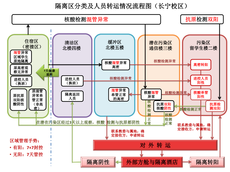 此外,长宁专班紧盯“三区两通道”关键环节不松懈并结合校区的实际,第一时间召集专班成员一起研讨分区化管理,设置“污染区、潜在污染区、缓冲区、清洁区”四个区域,并进行实地查验,优化隔离通道流线,梳理制作疫情防控应急处置流程图,建立任务具体、责任清晰、时间精准、信息闭环、落实到位的工作机制,坚决做到隔离管控无漏点、无死角,确保隔离点安全可管可控。