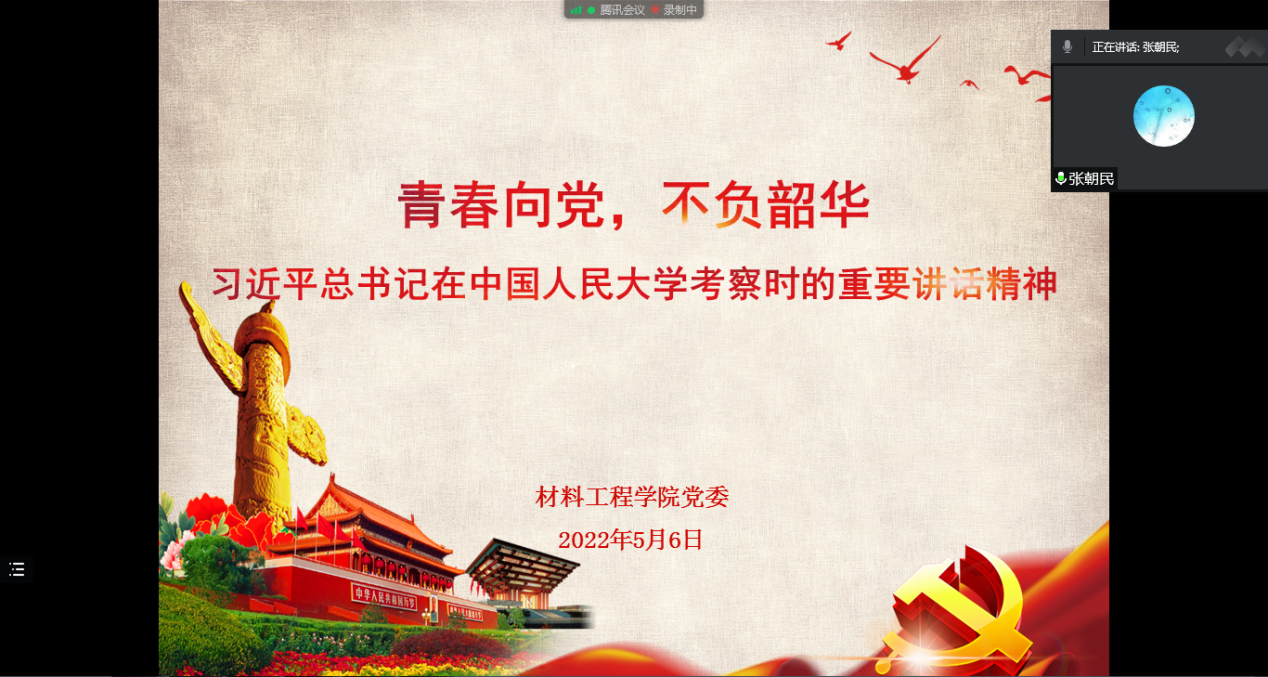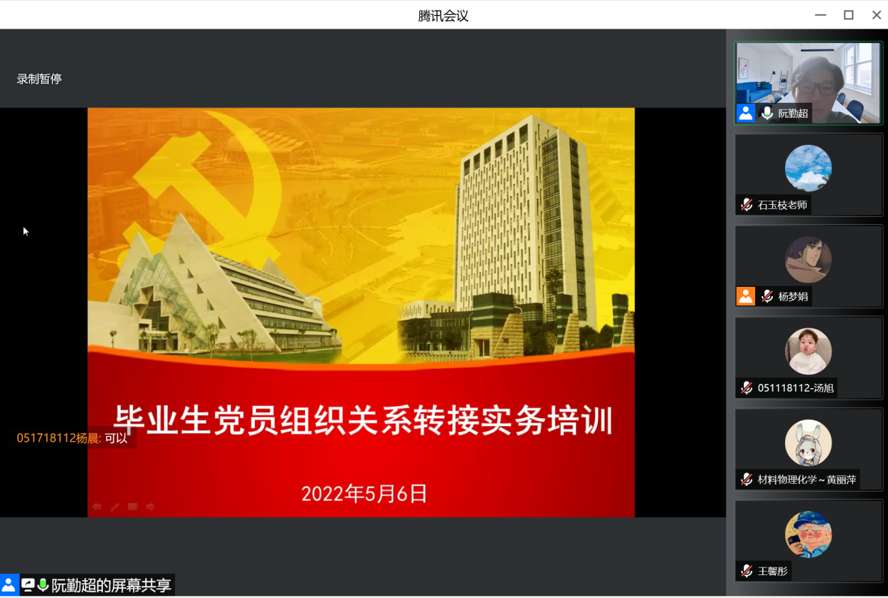 根据市委组织部、市教卫工作党委和学校党委关于做好2022年毕业生党员离校前教育和管理工作的相关通知要求,结合学校疫情防控工作实际,5月6日上午,材料工程学院党委在线开展毕业生党员离校教育,学院党委书记张朝民,校特邀党建组织员、校关工委委员、学院关工委常务副主任刘宇虹,学院党委副书记黄中子,学院党委组织员、党支部书记和毕业生党员出席会议。会议由黄中子副书记主持。