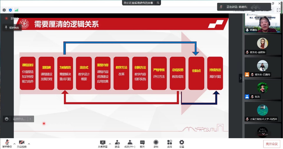 蒋建伟老师围绕一流课程建设和申报,为大家介绍了教育部关于一流课程建设的相关文件精神,重点讲解了线上、线上线下混合式一流课程的建设要点,强调一流课程建设要坚持立德树人,体现以学生发展为中心的教学理念;要坚持“学生中心、产出导向、持续改进”质量理念;要提升高阶性,突出创新性,增加挑战度;同时要严把政治关、学术关、质量关。