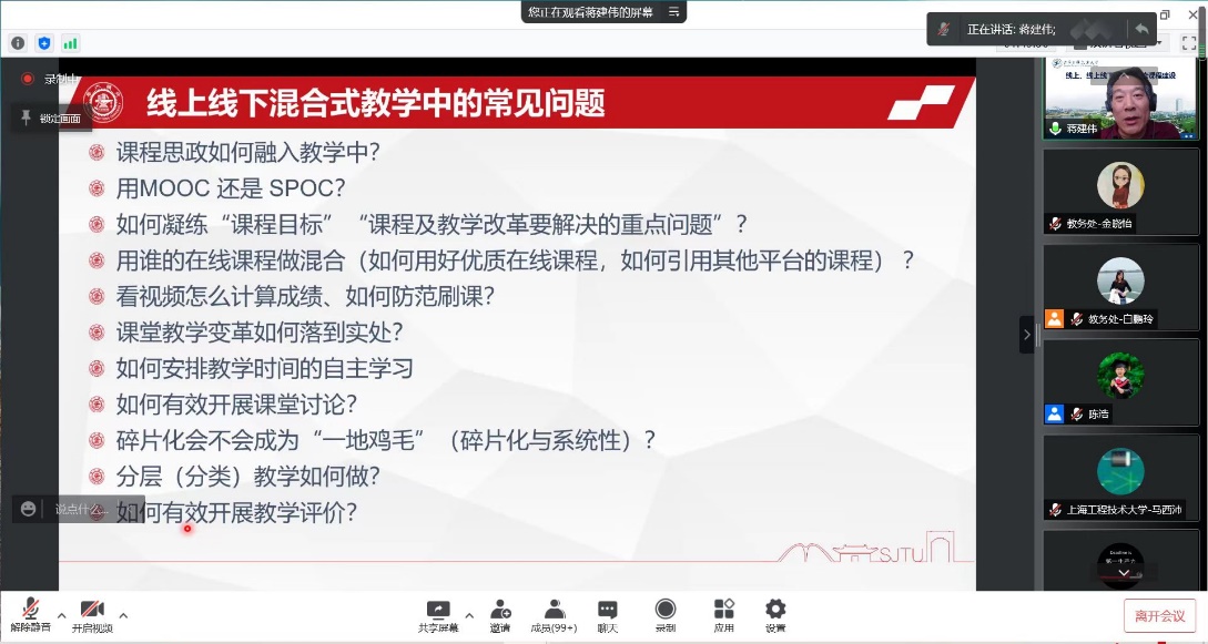 为帮助广大教师深刻理解线上、线上线下混合式一流课程的内涵,做好校级、市级、国家级线上、线上线下混合式一流课程培育建设申报工作,5月5日下午,学校通过腾讯会议召开线上、线上线下混合式一流课程建设培训会,特邀教育部高校教学信息化与教学方法创新指导委员会委员蒋建伟老师做题为《线上、线上线下混合式一流课程的内涵与建设实施》的专题报告。我校线上、线上线下混合式市一流、市重点课程负责人及团队成员,2019-2022年校级立项线上、线上线下混合式课程建设项目负责人及团队成员190人,教务处相关人员参加了本次培训会。培训会由教务处处长陈浩主持。