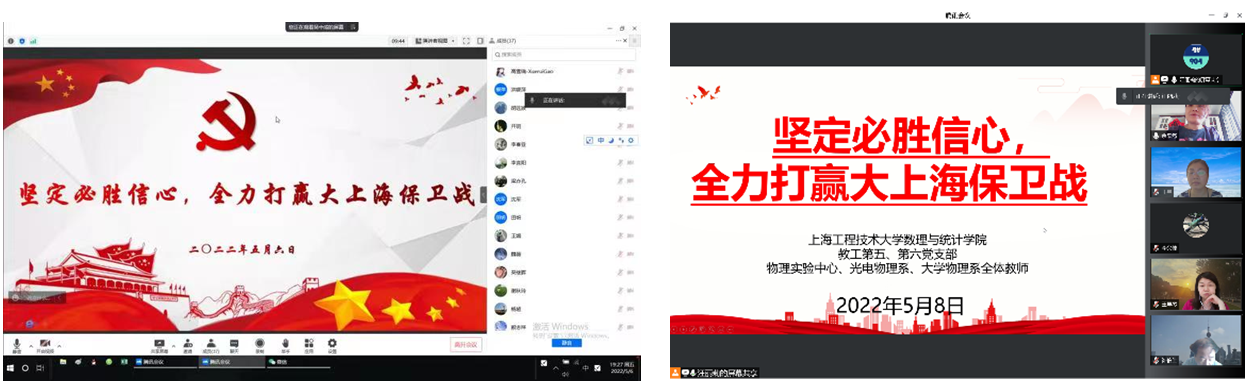 5月6日,教工第四党支部开展“坚定必胜信心,全力打赢大上海保卫战” 主题党日活动,支部书记叶红卫带领支部党员认真学习领会习近平总书记重要讲话精神和党中央、市委决策部署,要求支部党员增强责任意识,坚定必胜信心,自觉承担防控责任和义务,共同守护,筑牢疫情防控战线。号召党员在微信群、朋友圈等平台主动发声,积极宣讲好中央决策部署和各级部门疫情防控工作要求。支部党员王顾沁、黄璐彤、孙逢晗分享了参加疫情防控志愿工作情况,支部党员还就就如何上好网课,如何将思政元素融入线上教学,如何缓解学生的焦虑情绪与学业压力相互交流经验。5月8日,数理学生党支部组织支部党员、积极分子和学生开展主题党日活动,倡导广大学生党员、积极分子积极应对疫情,配合相关疫情防控措施,端正心态,筑牢疫情防控的屏障,学生党员继续保持冲锋在前,顽强拼搏的精神。支部党员进行了分享交流,研究生王芹认为,虽然在宿舍楼近两个月,但在学校的关心下,同学们积极乐观应对,状态良好。在疫情防控关键时期,作为一名大学生应该积极做一些志愿服务,学懂党的防疫政策,转换思维方式,缓解焦虑,坚定信念。