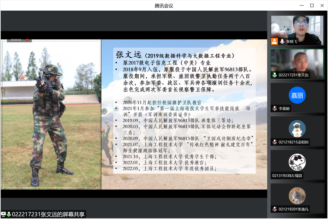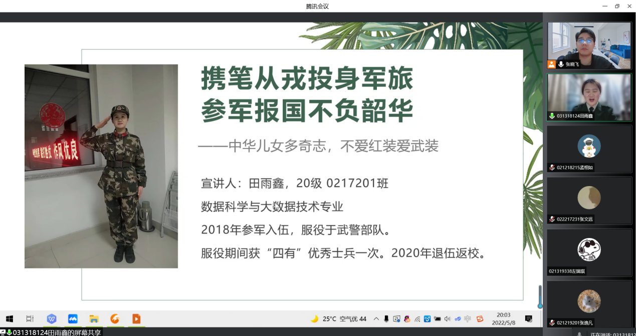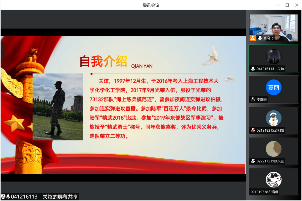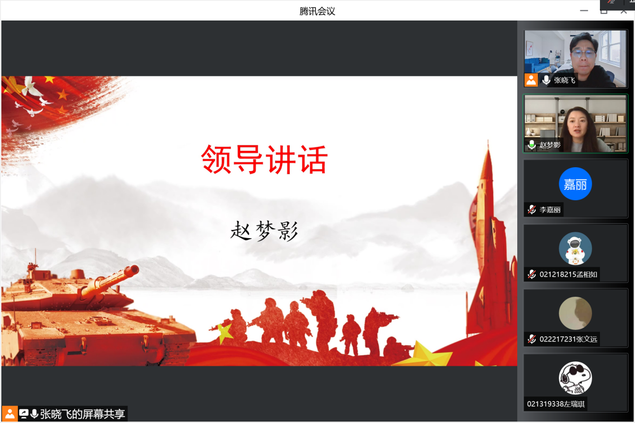 为深入学习贯彻习近平强军思想,树立精准征兵理念,为强军兴军提供更多高素质兵员,电子电气工程学院积极响应校武装部号召,于5月8日在线召开国防教育大会,学习新修订的《中华人民共和国兵役法》,同时进行2022年度秋季征兵工作动员。学院党委副书记赵梦影,辅导员梅是菲、张晓飞,优秀退役大学生张文远、田雨鑫、关炫以及200余名各年级同学参加会议。会议由征兵辅导员张晓飞主持。