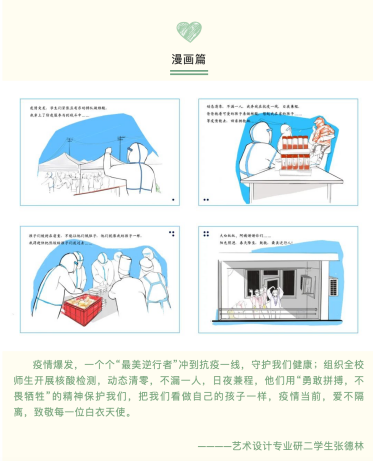 学院面向全体师生开展了口罩设计、抗疫主题艺术作品线上征集、抗疫班级云上分享会等活动,校内外学生积极参与,展现专业特长,一幅幅生动的漫画,一张张精美的摄影作品或发人深省,或抚慰人心,对这段特殊时期出现的人、事、物有着记录作用,同时也有着重要的宣传教育作用。防疫口号传递、抗疫精神理论云宣讲等活动,凝聚起广大师生的抗疫力量,各方戮力同心,背水一仗,共同守护校园安全。