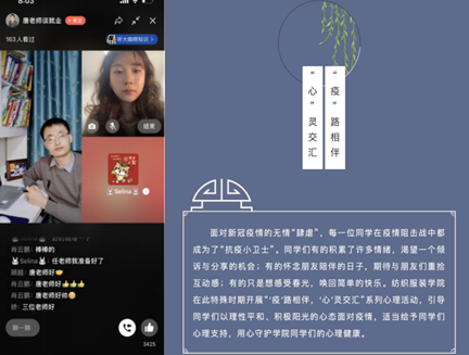 学院上新栏目——“导师下午茶”也受到师生们的广泛关注,本活动通过搭建师生零距离沟通桥梁,拉近距离,增强师生思想情感交流,开拓视野,增长见识,受益匪浅;辅导员唐全老师线上直播带“岗”,介绍就业市场招聘岗位,邀请企业HR做客直播间,为毕业生解答最关心的就业问题;学院还开展了系列心理辅导活动引导同学们以理性平和、积极阳光的心态面对疫情,给予同学们心理支持,用心守护同学们的心理健康。
