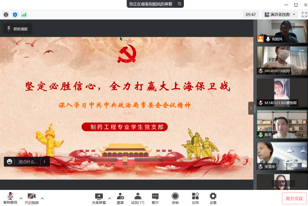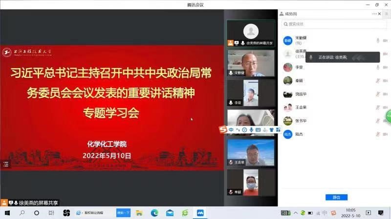 为深入学习贯彻习近平总书记在中共中央政治局常委会会议上的重要讲话精神和上海市委常委会扩大会议对疫情防控工作的要求和部署,化学化工学院党委中心组于5月10日召开专题学习会,学院全体党委委员、工会主席参加会议,会议由学院党委书记宋勤健主持。