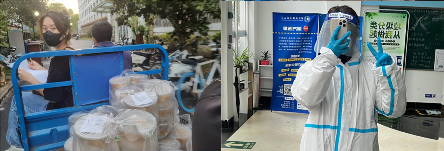 作为程园的一份子,勇于担当,召之能战。面对紧急情况,刘老师化身“大白”,整夜坚守在学生宿舍楼道里,守护着学生的安康,用实际行动共同保卫着程园;同学们足不出楼期间,化身“派送员”,坐上三轮车,逐楼逐栋为同学们送去餐食,笑着说一声:“同学,你的“外卖”到喽!”同学们连声道谢;社会各界的抗疫捐助与学校的慰问礼包分发工作中,刘老师化身“分拣员”,协调现场各楼层长领取分发给同学们的物资。让同学们真切地感受到来自社会各界及学校的关心关爱,也让他们更加懂得理解与感恩,共同为守护程园,打赢这场疫情防控阻击战而努力。