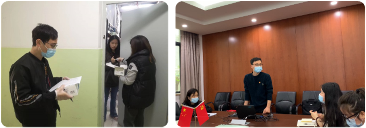 支部学生党员张坤,作为支部内唯一在校的学生党员,竭力做好驻楼防疫工作,服务学生,负责在校学生抗原、核酸情况统计、抗原试剂分发及收集、核酸检测队伍维持、抗疫物资分发等工作,同时征集学生生活与学习上的问题与困难,及时反馈、及时解决,同支部教师党员一起坚守在校内防疫阵地,以行践言,让党徽闪亮在抗疫的第一线。