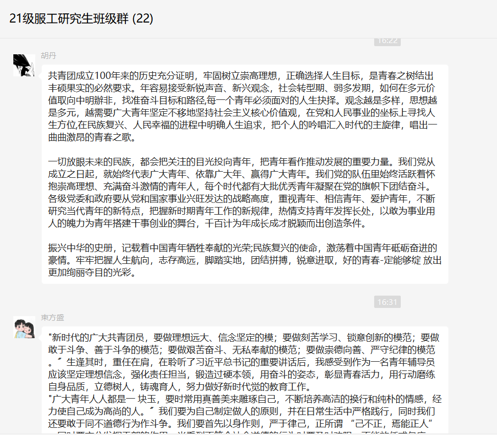 2021级服装设计与工程专业研究生团支部书记商璐璐组织支部成员进行线上学习活动并展开交流讨论。支部成员感悟:“建团100年专题讲话中,我们看到中国共产主义青年团百年的风雨兼程,这条百年道路布满着荆棘和曲折,即便如此共青团依旧迎难而上,披荆斩棘,紧紧的跟随着党的步伐砥砺前行。时光飞逝,如今我们正处在祖国繁荣昌盛的新时代,在享受新时代给予我们便利的同时,我们牢记初心,肩负起时代赋予我们的使命和责任,在青春年华里我们努力学习,积极奋斗,发奋图强,为实现中华民族伟大复兴做贡献。”