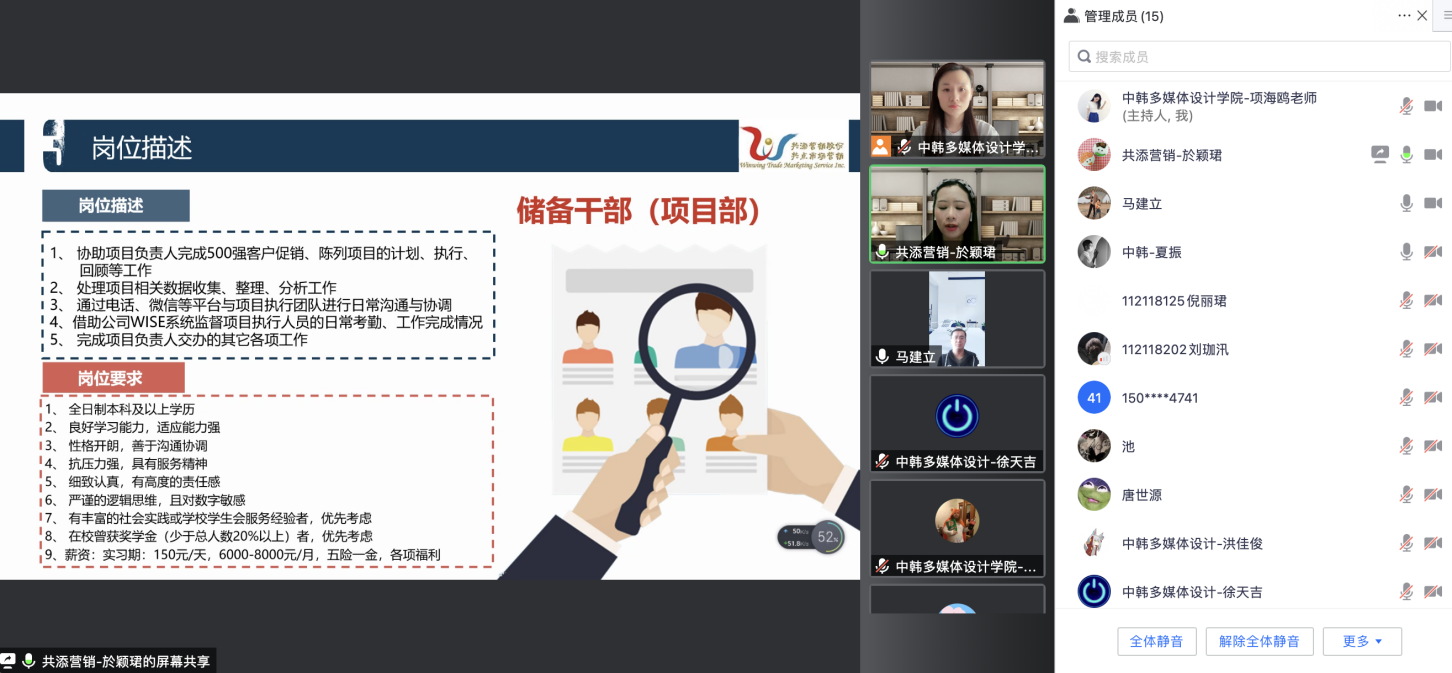 5月17日,为做好“百日冲刺”就业工作,中韩多媒体设计学院于腾讯会议召开企业招聘线上宣讲会暨“同力协契 奋楫笃行”就业精准辅导答疑会。艺术设计学院党委副书记马建立、上海共添市场营销服务股份有限公司营销培训部经理於颖珺、2022届毕业生出席会议。中韩多媒体设计学院辅导员项海鸥主持会议。
