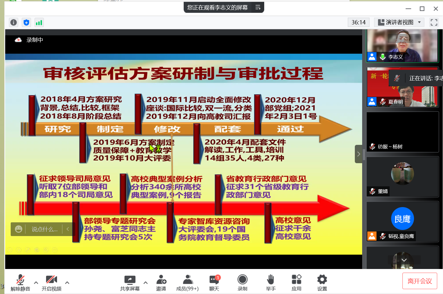 为促进学校本科教育教学质量提升、切实做好审核评估的学习动员,5月18日上午,教务处特邀大连理工大学原副校长李志义教授开展了题为“新一轮审核评估”的线上专题讲座。教务处(教学质量管理办公室、招生办公室、教师教学发展中心、创新创业学院)、工程教育发展研究中心全体教师,学校教学督导专家,学院教学副院长、学院教学督导专家、系主任、专业负责人、骨干教师代表等300余人参加了讲座。讲座由夏春明副校长主持。