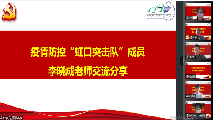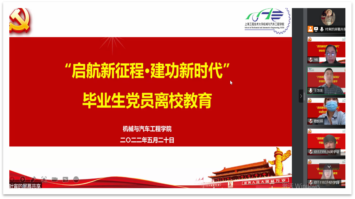 为切实抓好毕业生党员离校教育和管理工作,引导广大毕业生党员坚定信念、脚踏实地、不负青春韶华,开启人生新篇章。5月20日下午,机械与汽车工程学院党委线上举行“启航新征程·建功新时代”毕业本科生党员离校教育活动。学院党委书记虞蓉、副书记王东阳、“虹口突击队”成员李晓成、学院组织员、本科生党支部书记和全体2022届毕业本科生党员、党员代表等参加会议。本次离校教育活动由学院党委副书记王东阳主持。