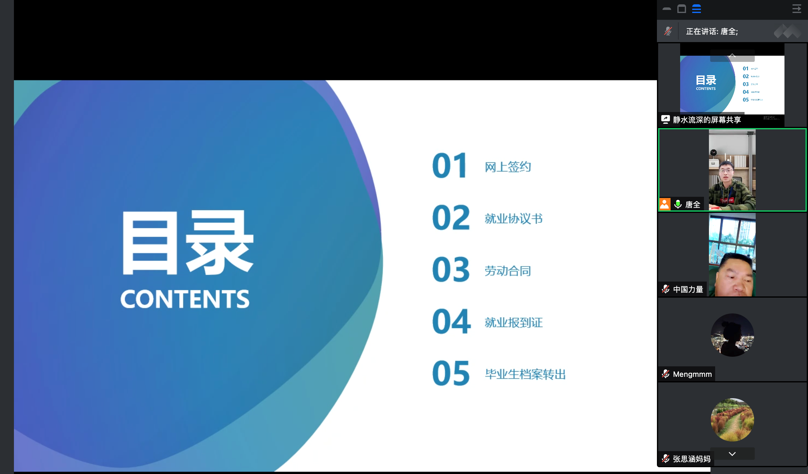 就业辅导员任凡老师首先对2022届毕业生就业形势进行了详尽的分析,重点介绍了毕业生目前的就业状况以及校、院两级在疫情期间实行的就业举措,告知家长学院已通过举办线上招聘会、开展线上求职技能培训等措施来促进和引导学生积极就业,希望家校一起联动鼓励学生尽早落实毕业去向。就业辅导员唐全老师向学生家长介绍了就业手续办理流程及注意事项,对就业协议书、报到证和毕业生档案做了解释说明,并且重点介绍了签订就业协议书和网签的具体程序。