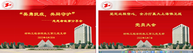 疫情当前,材料工程学院教工第三党支部全体党员坚守人民至上理念,坚持“动态清零”总方针不动摇,认真落实“双报到”制度,全员参与所在区域志愿服务,带头落实好各项管控举措,让党旗飘扬在上海保卫战第一线。