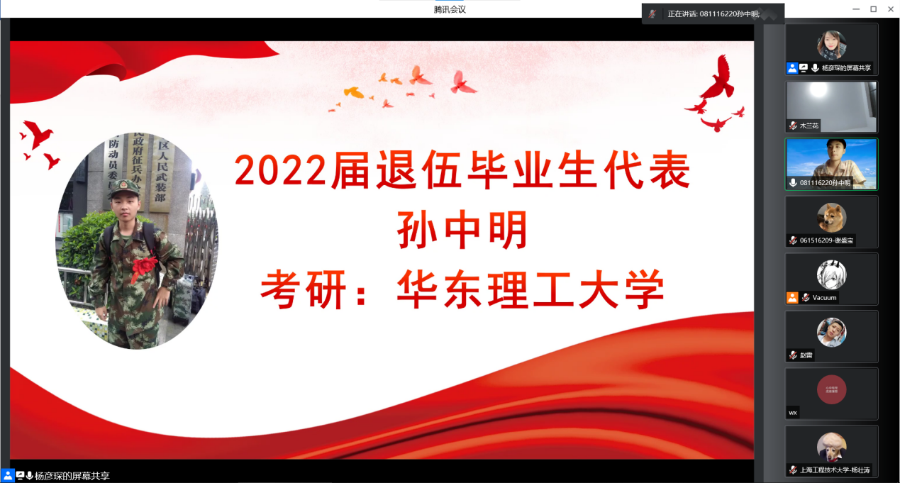 为了鼓励有志青年并使同学们能更直观地感受军营生活所带来的改变,活动邀请2022届毕业生中的两位退役士兵谢盛宝和孙中明分别分享军营所带给自己的历练与思考,并从求职就业和考研备考不同的角度分享了自己的经验和建议。