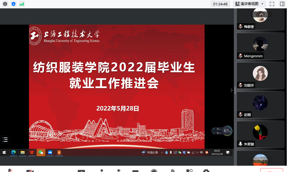 面对当前严峻的就业形势,为进一步推进毕业生就业,为学生高质量就业做好服务,5月28日,纺织服装学院召开线上就业推进会,学院党委书记朱君璇,党委副书记、院长谢红,全体班子成员,各专业系室主任,全体辅导员参加会议。会议由学院党委副书记谢志霞主持。