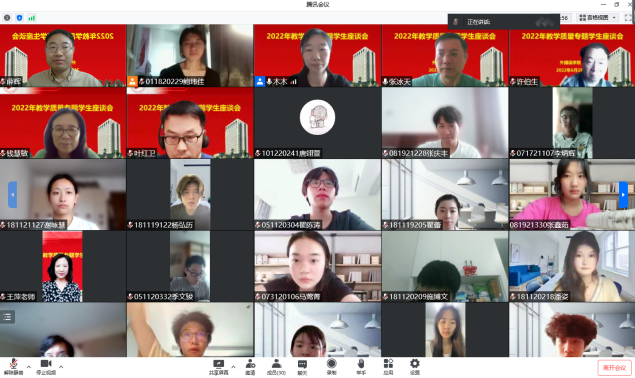 为全面贯彻党的教育方针,积极落实立德树人根本任务,更好地提高本科教学质量和人才培养质量,正确处理好管理与服务之间的关系,了解掌握学院师生对教学的意见和建议,为迎接新一轮审核评估打好基础。6月2日下午,外国语学院通过腾讯会议分别召开了教学质量专题教师座谈会和学生座谈会,数理外国语联合党委书记钱慧敏,外国语学院院长王刚出席会议。教师座谈会由刘金龙副院长主持,学生座谈会由张冰天副院长主持。