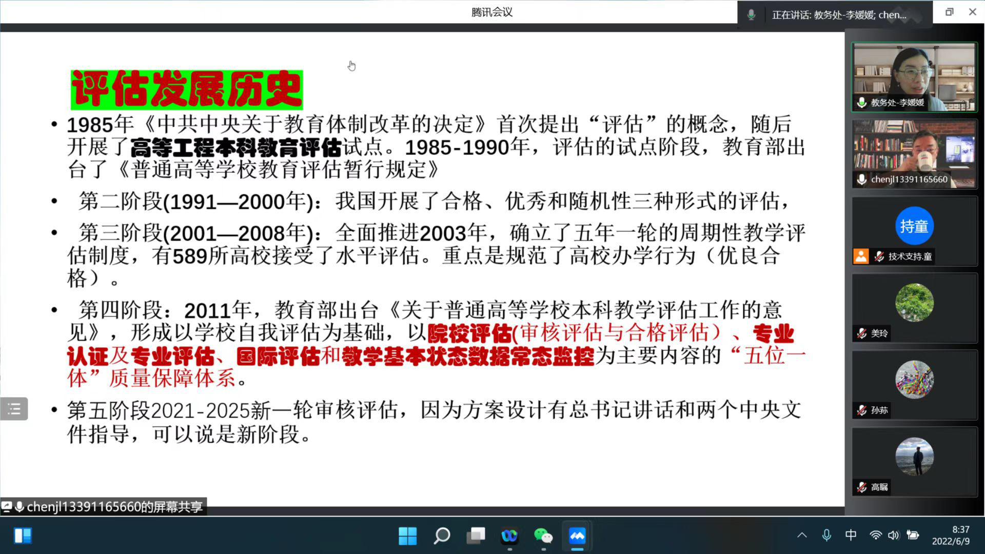 陈敬良教授结合自己作为上一轮审核评估和新一轮审核评估核心专家的丰富经验,从“新一轮审核评估方案出台背景、指导思想、核心要求、新一轮审核评估的变化、新一轮审核评估的六个阶段、审核评估基本状态数据填报、自评报告的撰写、第二类审核评估指标体系方案设计的特点、个性化评估方案如何选择、第二类指标体系中个性化选择”十个方面,深入浅出地介绍了新一轮审核评估工作。尤其是“第二类指标体系中个性化选择”部分,陈教授详细讲解了每个三级指标的重点考察内容,并从统一必选、定量必选与定量可选项的角度,强调了各指标体系的关注要点。