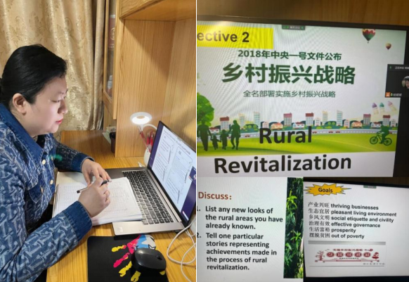 外国语学院杨媛媛老师在《大学英语口语(三)》第二单元City life单元主题教学过程中,在引导学生比较与讨论城市与乡村在经济、社会、文化、生活等方面的异同之后,聚焦“乡村振兴”这一课程思政专题,采用“产出导向法”进行英语口语教学。杨老师巧妙地将爱国主义教育、人格品质教育、理想信念教育、中国文化教育等内容融入大学英语口语教学的各个环节,逐步帮助学生树立正确的世界观、人生观和价值观。培养立足中国、放眼世界,有能力未来参与国际事务、传播中华文化、讲好中国故事、阐释中国特色的时代新人。
