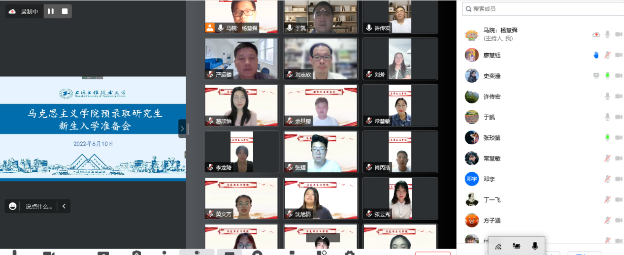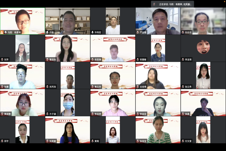 为进一步加强马克思主义学院研究生学风建设,助力2022级预录取研究生新生提前适应研究生阶段学业要求和学习任务,帮助同学们扎实做好入学前的相关准备。6月10日晚上,马克思主义学院在线召开2022级预录取研究生新生入学准备会。马克思主义学院党总支书记许传宏,院长刘志欣,副院长于凯、严运楼、刘芳出席会议,研究生辅导员杨慧舜老师及2022级预录取研究生新生参会。会议由副院长于凯主持,师生相聚云端,展开交流分享。