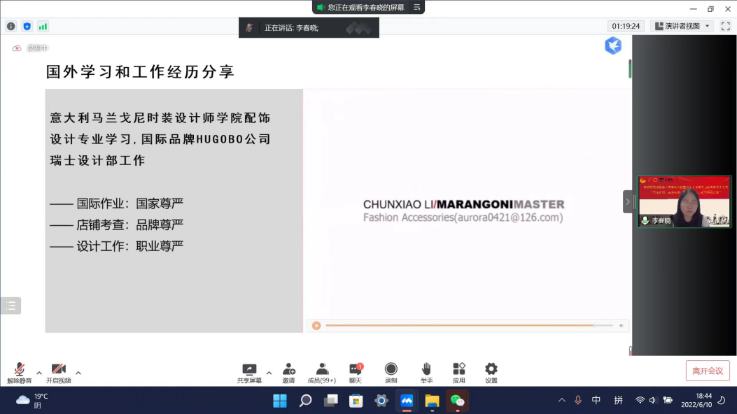 开班仪式后,服装与服饰设计(中法合作)系主任李春晓老师讲授团校第一课——“设计思考与设计价值——北京2022年冬奥会和冬残奥会制服装备视觉外观设计体验分享”。李春晓老师曾荣获“北京2022年冬奥会和冬残奥会制服装备外观设计”银奖,通过自身求学及团队制作冬奥会和冬残奥会制服装备视觉外观设计的生动实践过程从挑战自我、集体智慧以及合作提升三个层面阐述奥运精神,奥运精神是和平、友谊、团结,能够应用至生活学习的方方面面。同学们纷纷表示听完课程后受益匪浅,既是听取了一节意义非凡的团课更是听取一节专业课,作为两个一百年交汇时期的当代青年,要肩负起下一个百年征程建设的责任担当。