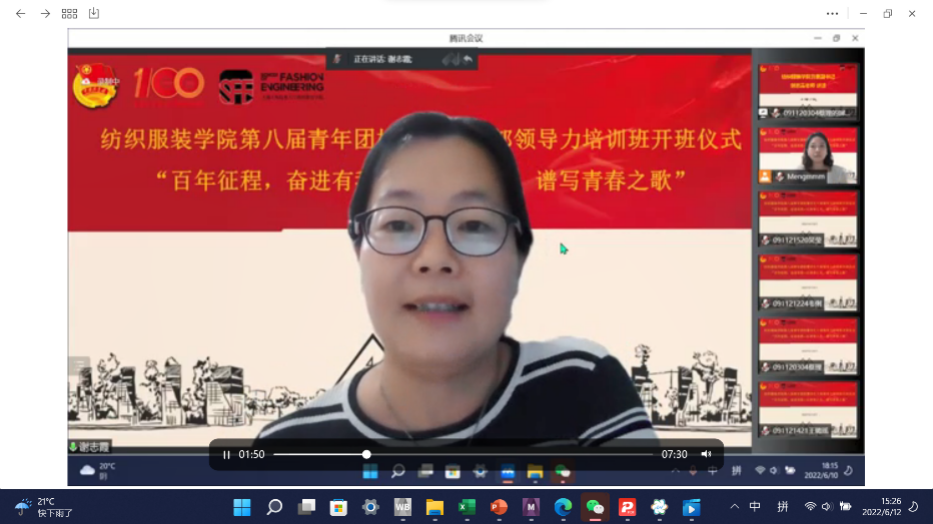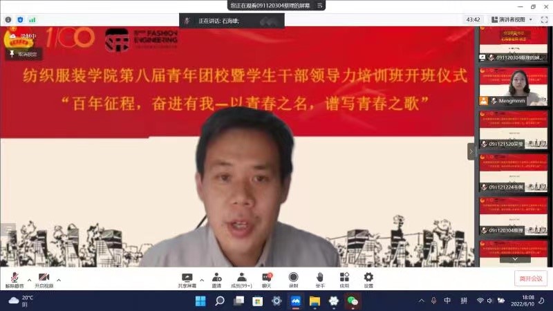 为进一步加强团学干部思想政治建设,打造一支本领过硬、带头服务、能发挥表率作用的团学队伍。迎接和学习宣传贯彻党的二十大,庆祝建团百年,强化广大团员青年的政治品格,赓续红色血脉,夯实精神之本、熔铸精神之源。纺织服装学院于6月10日举行“百年征程,奋进有我——以青春之名,谱写青春之歌”青年团校暨学生干部领导力培训班开班仪式,纺织服装学院党委副书记谢志霞、校团委副书记石海雄、学院团委负责人任凡以及学院学生会骨干、班级团支书、入团积极分子等共计100余名学生参加仪式,仪式由学院团委负责任人任凡主持。