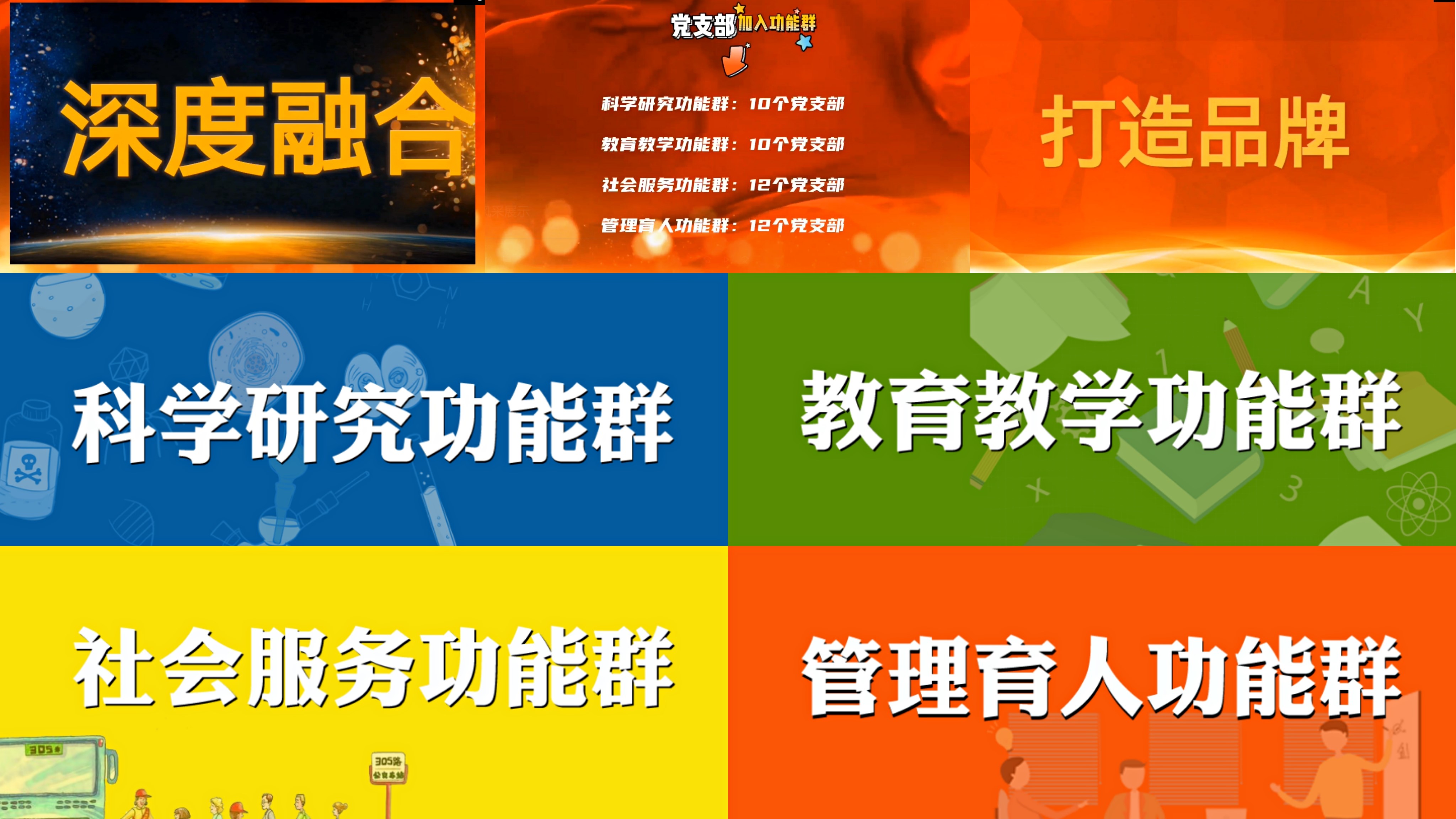 会上,科学研究功能群群主、机械与汽车工程学院党委能源与动力工程系教工党支部书记邓胜祥以《党建引领促进科学研究》为题,教育教学功能群群主、马克思主义学院党总支思想道德修养与法律基础教师党支部书记马可以《党建引领教育教学 为党育人为国育才》为题,社会服务功能群群主、机械与汽车工程学院党委机械工程专业本科生党支部书记聂红以《夯实党建之基 提升服务能级》为题,管理育人功能群群主、机关党委团委党支部书记董旖旎以《落实立德树人根本任务 提升支部管理育人实效》为题,分别介绍了各功能群支部基本情况、特点,建设的方案和计划,建设目标等。