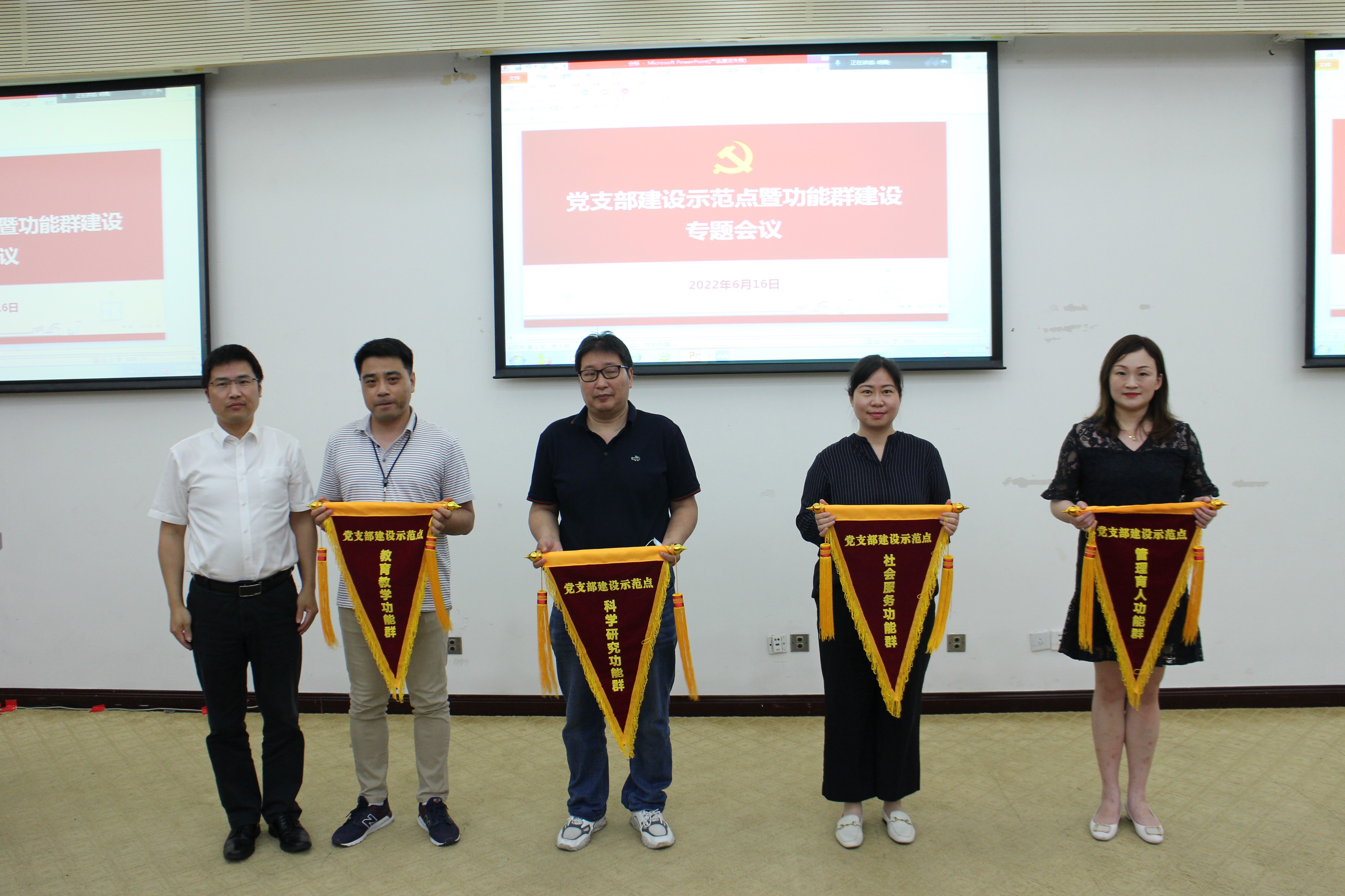 校党委常委、组织部部长朱洪春同志为科学研究、教育教学、社会服务、管理育人4个党组织功能群授旗。党委组织部副部长熊伟介绍了学校“党支部建设示范点”的立项情况及培育创建期间的工作方案。