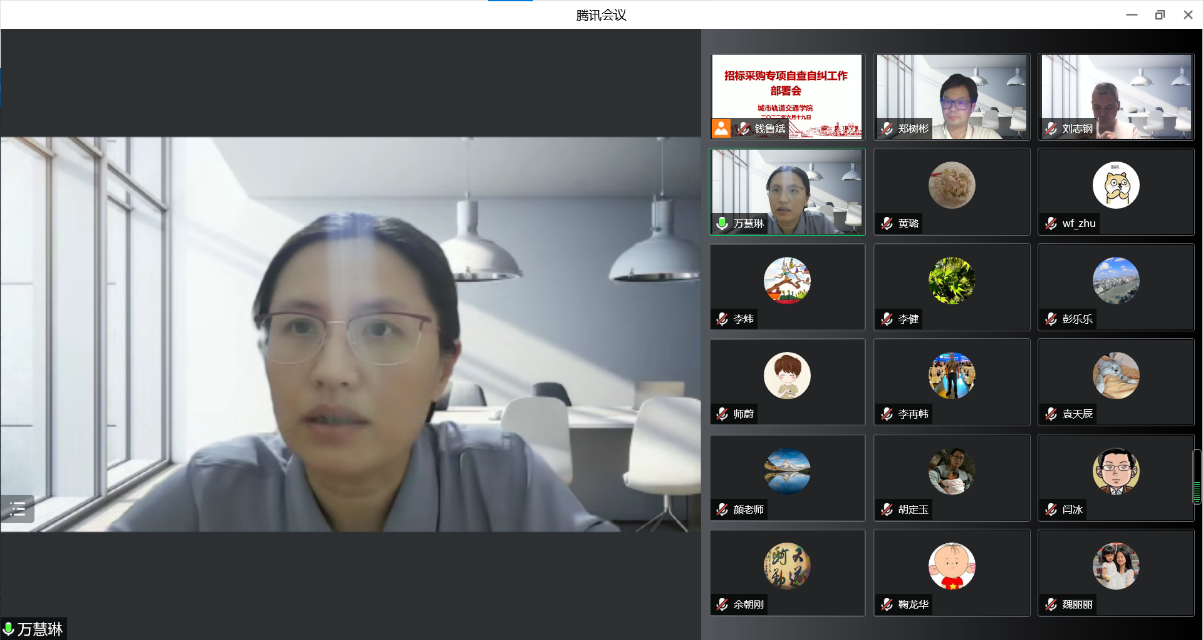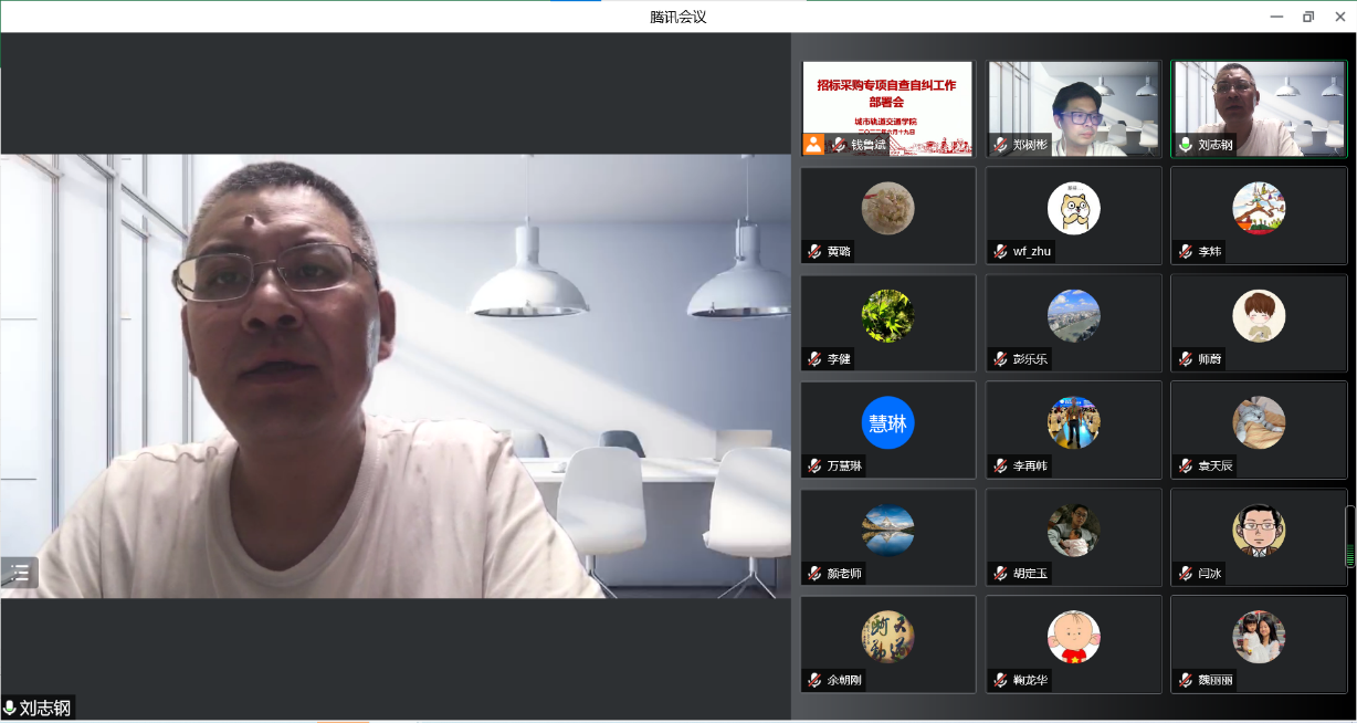为贯彻落实十九届中央纪委六次全会和十一届市纪委六次全会精神,切实做好巡视回头看整改工作,深化招标采购领域专项治理和廉政风险防控建设,6月19日,城市轨道交通学院召开招标采购专项自查自纠工作部署会。学院党委书记万慧琳,党委副书记、院长刘志钢,副院长郑树彬,党委委员、纪检委员李健出席会议,招标采购自查自纠工作小组和全体项目负责人及经手人参加会议,会议由郑树彬副院长主持。